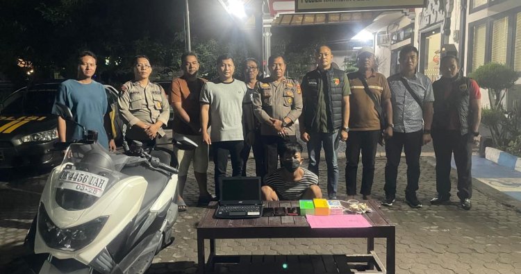 Adapun barang bukti yang berhasil diamankan meliputi satu unit sepeda motor Yamaha NMAX, satu unit handphone merek Oppo, satu unit laptop merek Acer, serta lima unit handphone dari berbagai merek.